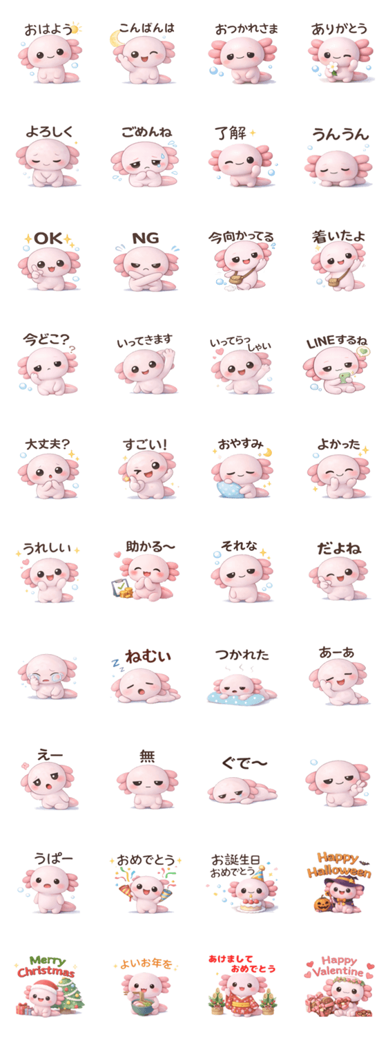 かわいいウーパールーパーがちょっとだけ虚無。 日常会話でよく使う言葉を中心に、イベントも入ってずっと使えるスタンプです。 かわいい〜完全虚無まで詰め込みました。