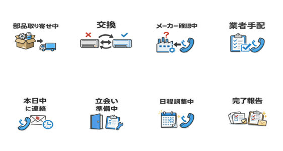 不動産管理の現場で使いやすい連絡スタンプ。日程調整・確認・案内・報告など、日常業務の連絡をスピーディーに共有できます。社内・オーナー・入居者対応に幅広く使えます