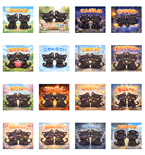 サナ(左目ブルー)とキキの超かわいい黒猫スタンプ!毛糸のあみぐるみ風で、日常会話に使いやすい表情がいっぱい。猫好きさんにぴったり♪