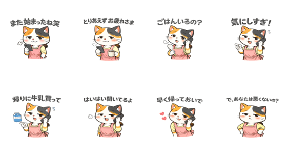 がんばる夫にそっと寄り添う、妻猫チャコの返信スタンプ。 おつかれさま、気にしすぎ、早く帰っておいで…など日常会話に使いやすい内容です。