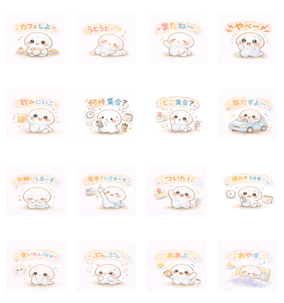 ゆるくて、ふわっとしたスタンプ。 「おあよ」「ついた!」「遅れそう…」など、毎日の連絡やお出かけに使いやすい。 がんばらない会話に、そっと寄り添うスタンプです。