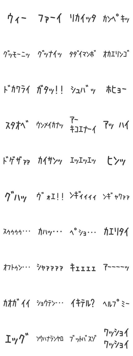 語彙力が低下している時、奇声を上げたい時、だるい時、なんとなくの時に使える半角カタカナの文字スタンプです。