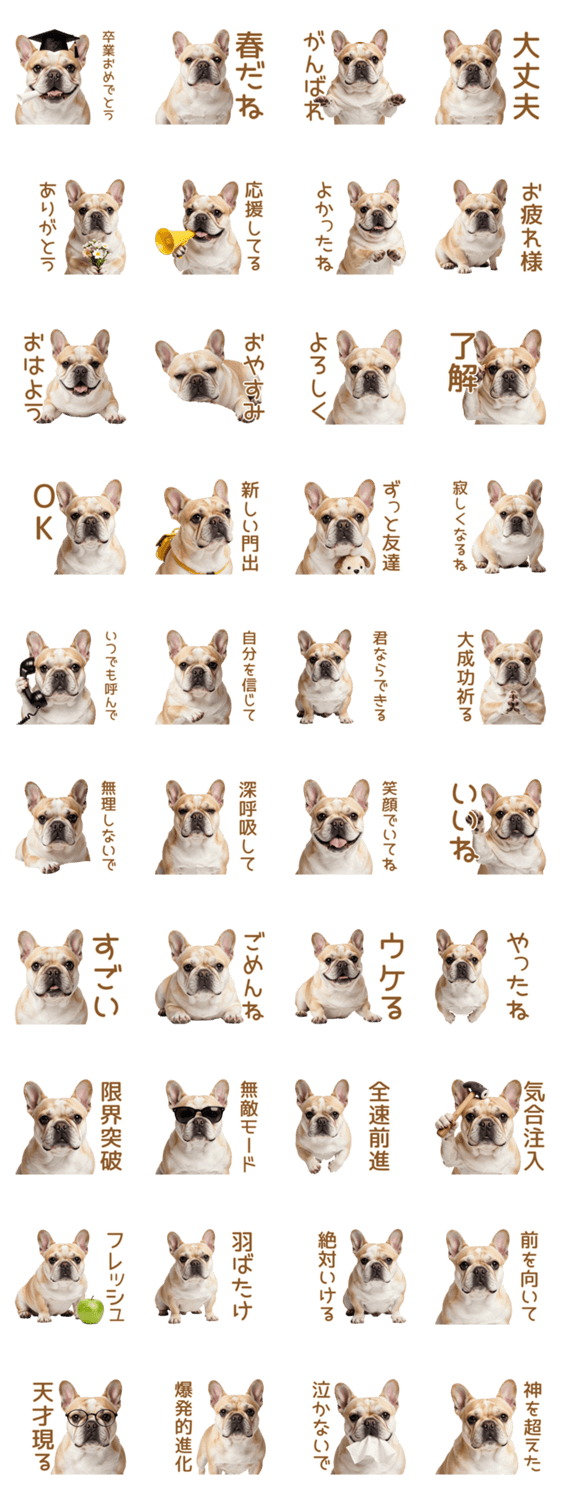 | スタンプ説明 | 卒業や春のご挨拶、毎日の応援に!もちもちフレンチブルドッグが全力でエールを送る癒しスタンプ。友達や家族にかわいい犬がほのぼの日常をお届け♪ |