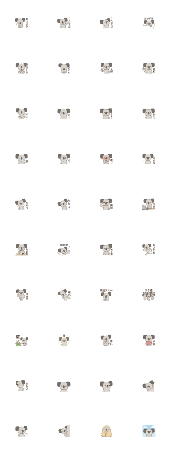 独特な四角い耳のコアラが日常の挨拶や丁寧な返信を伝えます。ビジネスや友達との連絡に便利な敬語と、表情だけでも語れます。