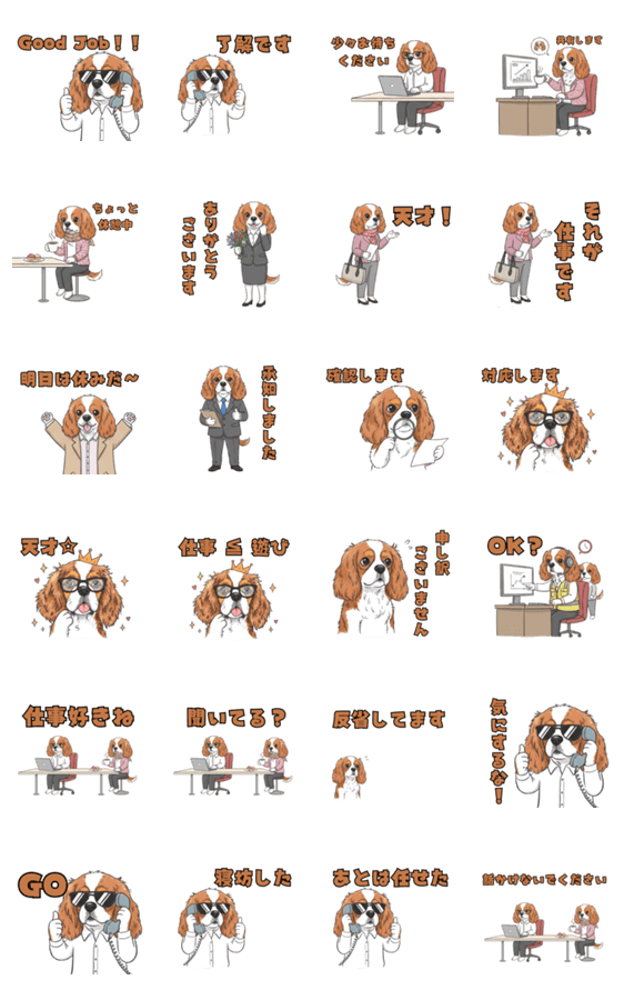 仕事やオフィスでのチャットにぴったりの、キュートなキャバリアのステッカー。毎日のビジネス会話に使いやすいです。