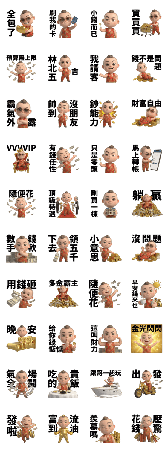 Meet the Crane Tycoon! Enjoy the lavish life with confidence. Big text stickers full of wealth and swag for your daily chats.