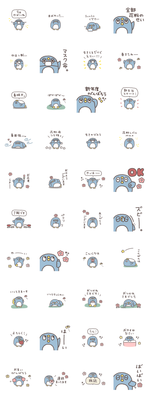 一つあると便利なちびっこペンギンのスタンプです! ペンギン/無気力/あいさつ/花粉/春