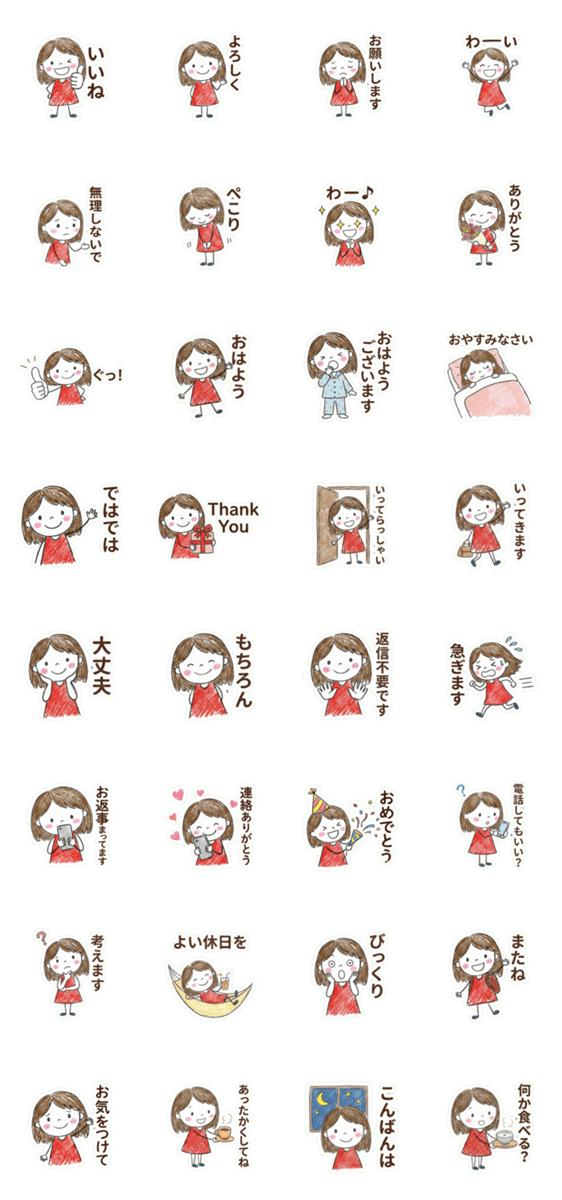 赤いワンピースがトレードマークの女の子。クレヨン風の温かいタッチで、日常の挨拶から体調を気遣う言葉まで、使いやすい敬語と丁寧な言葉。家族や友人への連絡にぜひ。