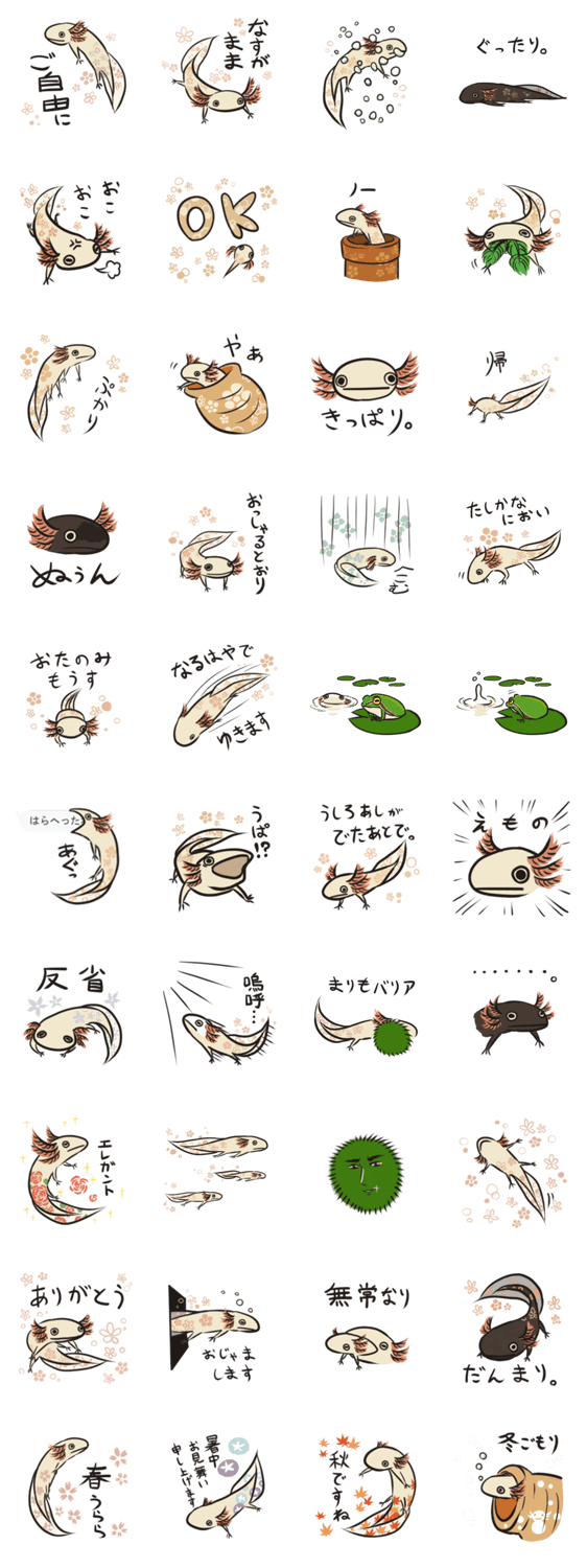 花柄のウーパールーパーのスタンプです。基本的に無表情です。