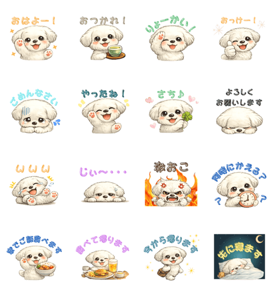 | スタンプ説明 | かわいいマルチーズの家族連絡用スタンプです。日常会話に使いやすい挨拶や確認メッセージを集めました。 |