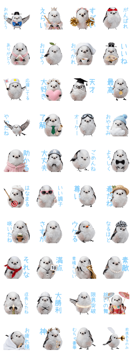 | スタンプ説明 | 全肯定シマエナガが春のひなまつりを全力でお祝い!「えらい」など毎日使える褒め言葉や優しい挨拶がいっぱい。友達や家族に癒やしとほのぼのした応援を届けよう。 |