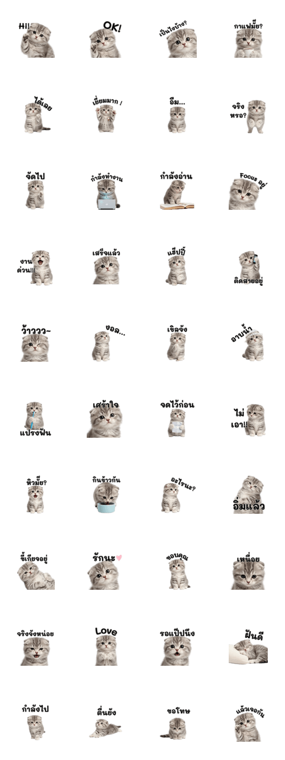 A set of photorealistic fluffy Scottish Fold kitten stickers. Perfect for daily conversations. Soft, adorable, and suitable for everyday chat. Cat / Kitten
