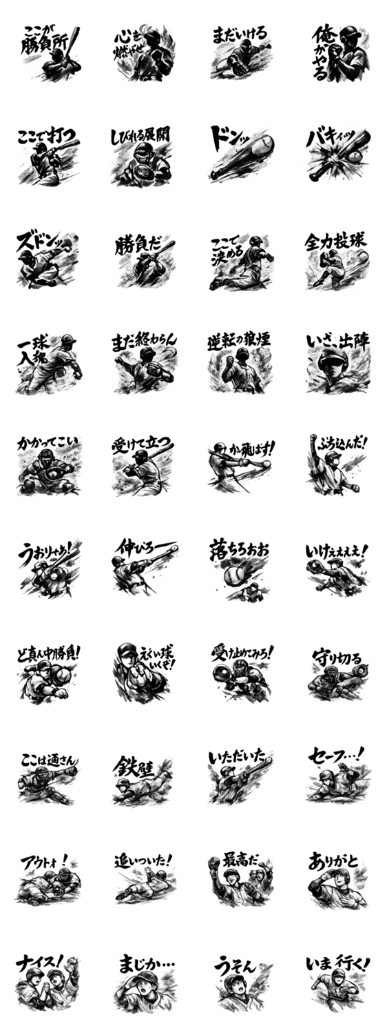 スポーツファンのための墨絵野球応援スタンプ。応援メッセージや試合の日の盛り上げ、日常会話にも使える力強い筆文字リアクション。