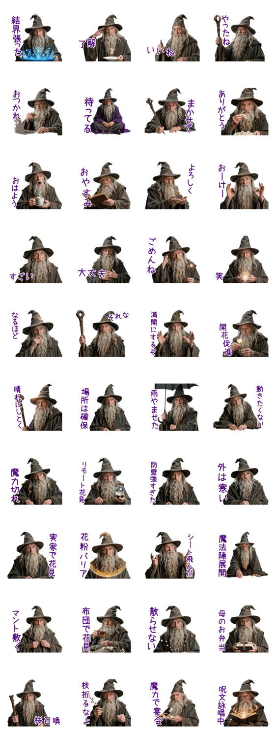 | スタンプ説明 | 年齢300歳!「実家暮らし魔法使い」が魔力でお花見の場所取りや挨拶をこなすシュールなスタンプ。花粉バリアやリモート花見など笑えるネタ満載で春を満喫しよう。 |