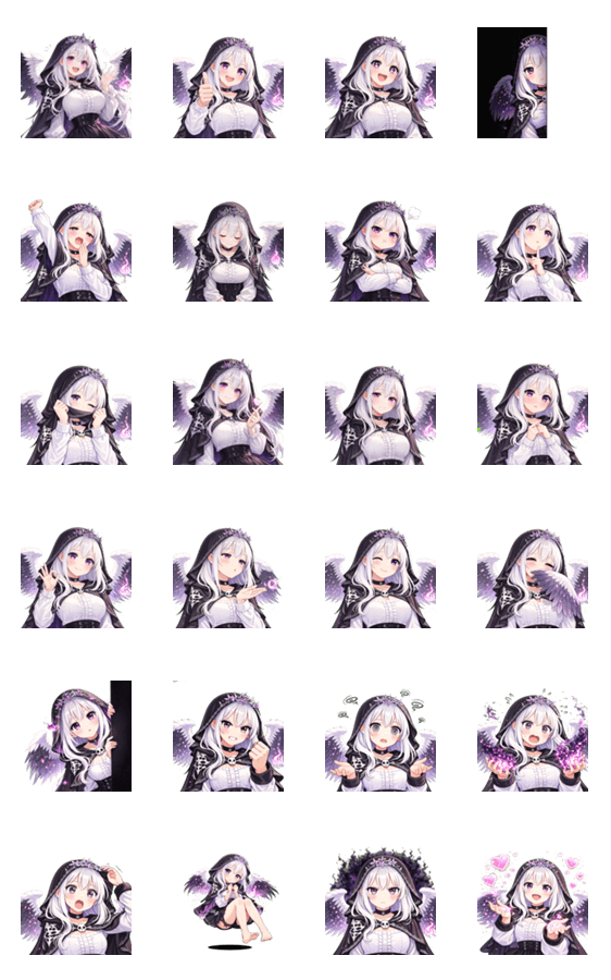 黒フードのゴシック天使がかわいい表情で使えるスタンプです。ダークファンタジーと萌え感が好きな方にぴったり。日常会話にも使いやすい反応がそろっています。
