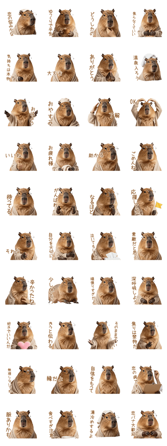 | スタンプ説明 | 癒しカウンセラーカピバラ先生が温泉から全肯定!深夜の限界恋バナや失恋の悩みにシュールに寄り添うスタンプ。ほのぼの優しく包み込み、恋の病を温めます。 |