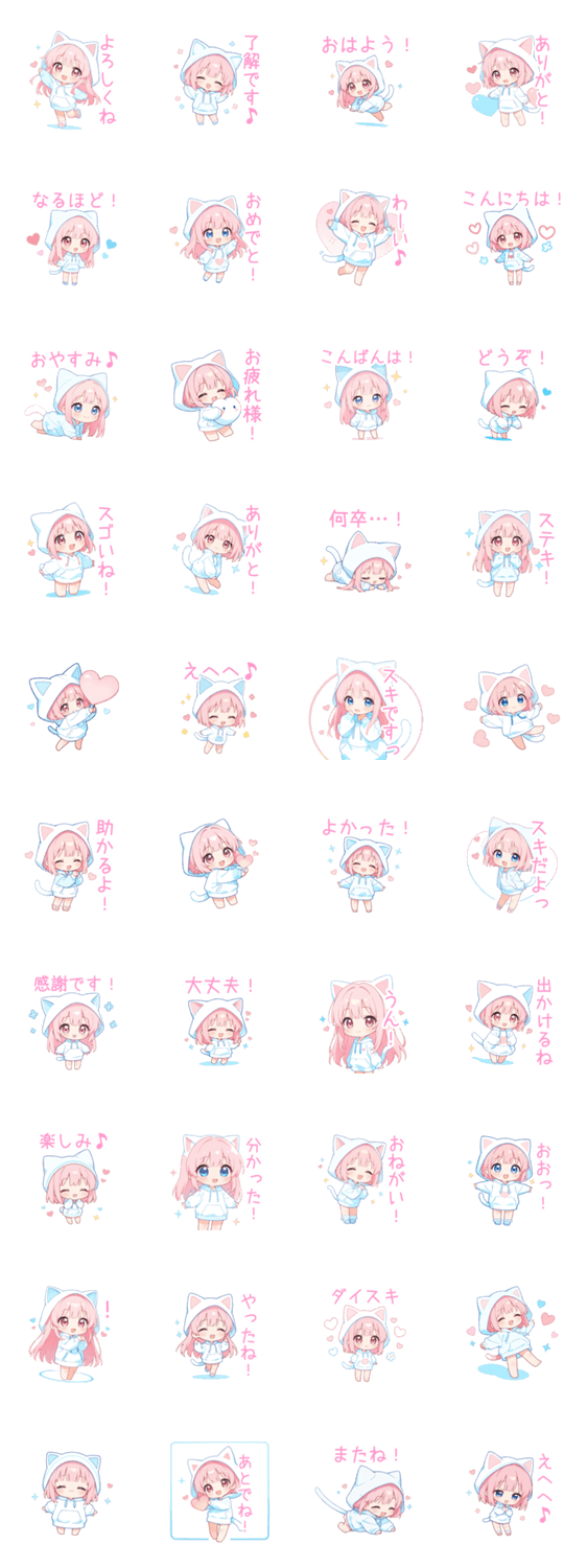 猫/猫耳/フーディー/可愛い/量産型/ピンク/日常/水色/ピンク髪/パステル/女の子/女子/ガーリー/ミニキャラ/キュート/ファンシー/毎日使える/挨拶/ちびキャラ/癒し/猫の日