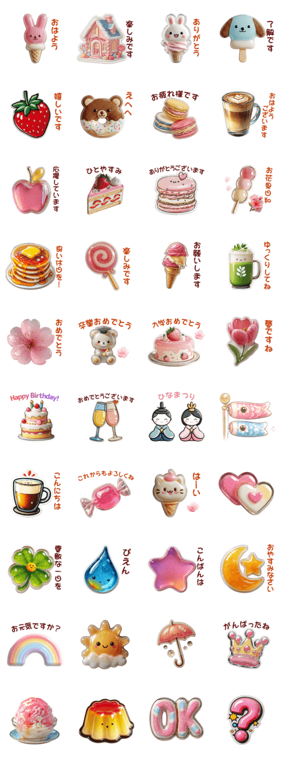 | スタンプ説明 | ぷっくり立体感がかわいい♪トーク画面をシールでデコるように楽しめます。春/桜/卒業/入学/いちご/しずく/ひな祭り/鯉のぼり/お祝い/ぷくぷく/動物/日常/毎日/可愛い/挨拶 |