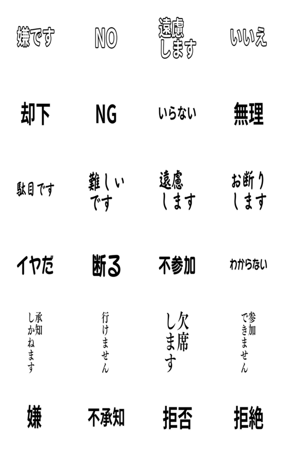 気分によって使い分けできる色々な書体・嫌・いいえ・却下・NG・無理・駄目・断る・不参加・欠席・反対・不承知・拒否・拒絶・文字のみ・文字だけ・ペン字・丸文字・明朝体 ※このスタンプはトークルームで大きく表示されるBIGスタンプです。