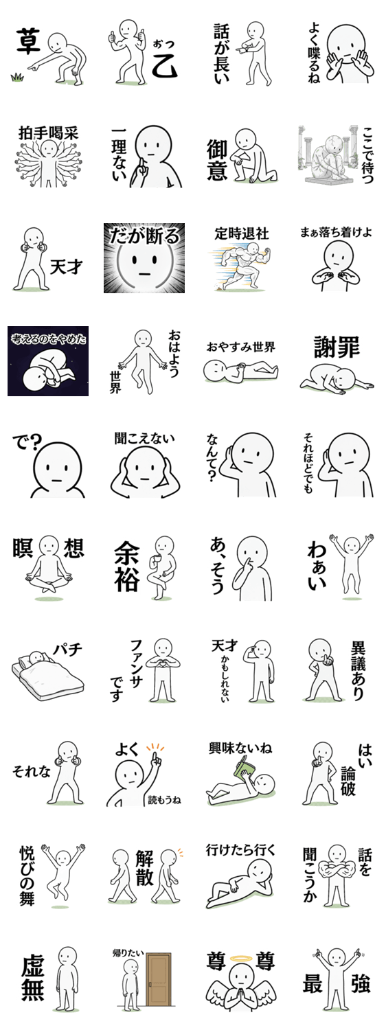 全身タイツ男が、あなたの代わりに淡々と無駄な躍動感で感情を伝えます。友達への煽り、ツッコミ、日常の挨拶まで、これ一つで完結。真顔で「草」を生やしたい時にどうぞ。