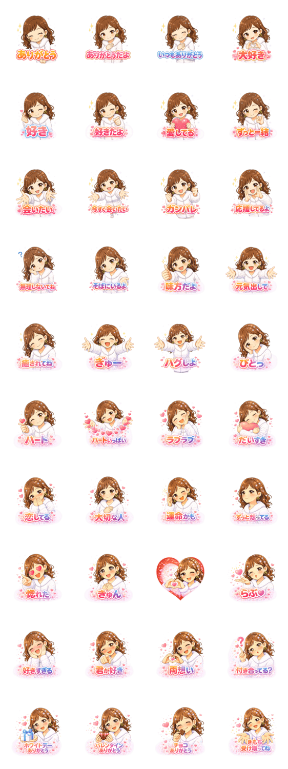ふわもこ白ファーが可愛い女の子。 「ありがとう」「大好き」「応援してる」など、感謝や恋の気持ちをやさしく伝えられます。 毎日のトークに使いやすい癒し系スタンプ