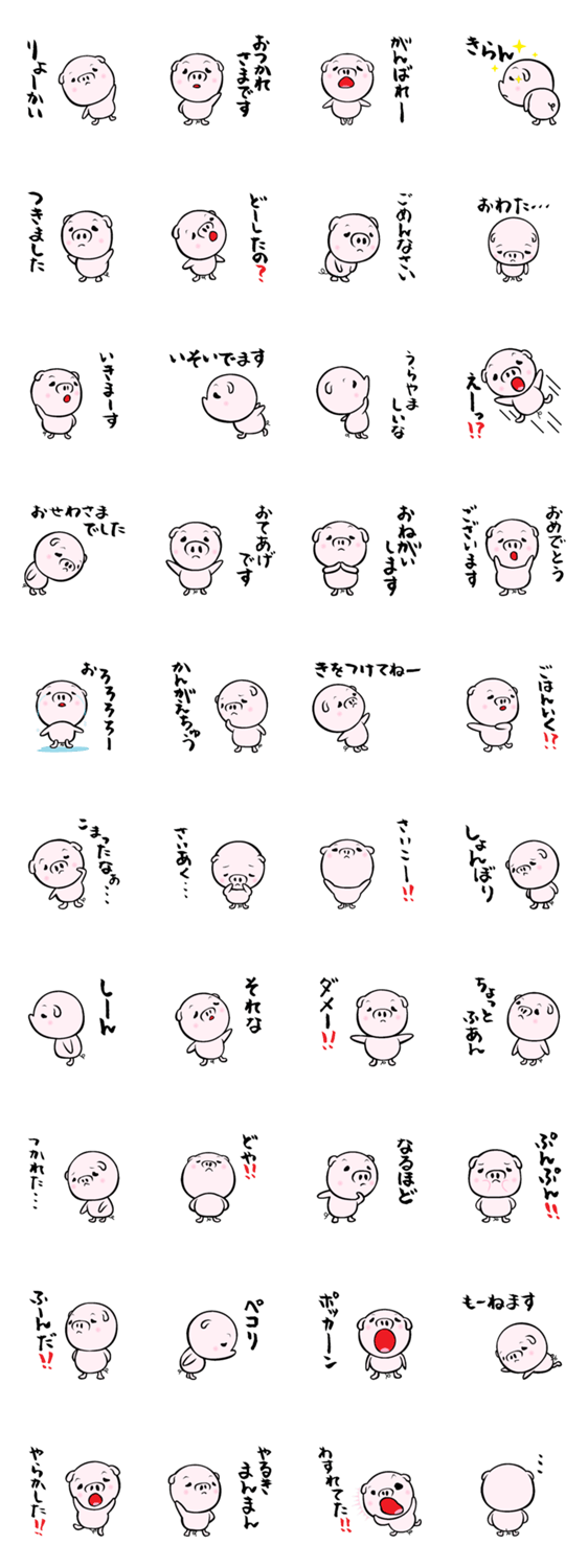 | スタンプ説明 | ぶたです。かわいい?豚のスタンプを使ってみてください。いつでも気軽に使えるスタンプです。3段目から五十音順です。 |
