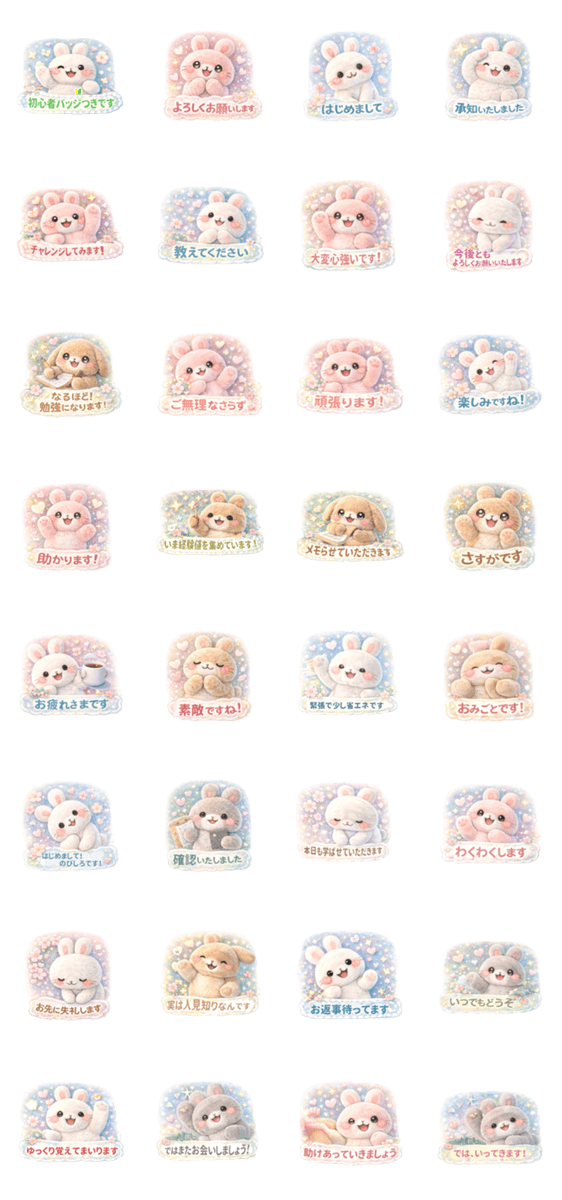 | スタンプ説明 | 新社会人・第二新卒・幼稚園や小学校、習い事などで保護者の輪に入りたての大人の新人に向けて使いやすい。優しいほんわかフェルトみたいなうさぎが丁寧敬語で語ります |