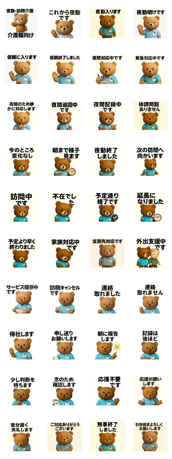 | スタンプ説明 | 夜勤や訪問介護の現場で使いやすい、静かで配慮ある業務連絡スタンプです。時間帯や状況を選ぶ連絡も、スタンプでスマートに伝えられます。 |