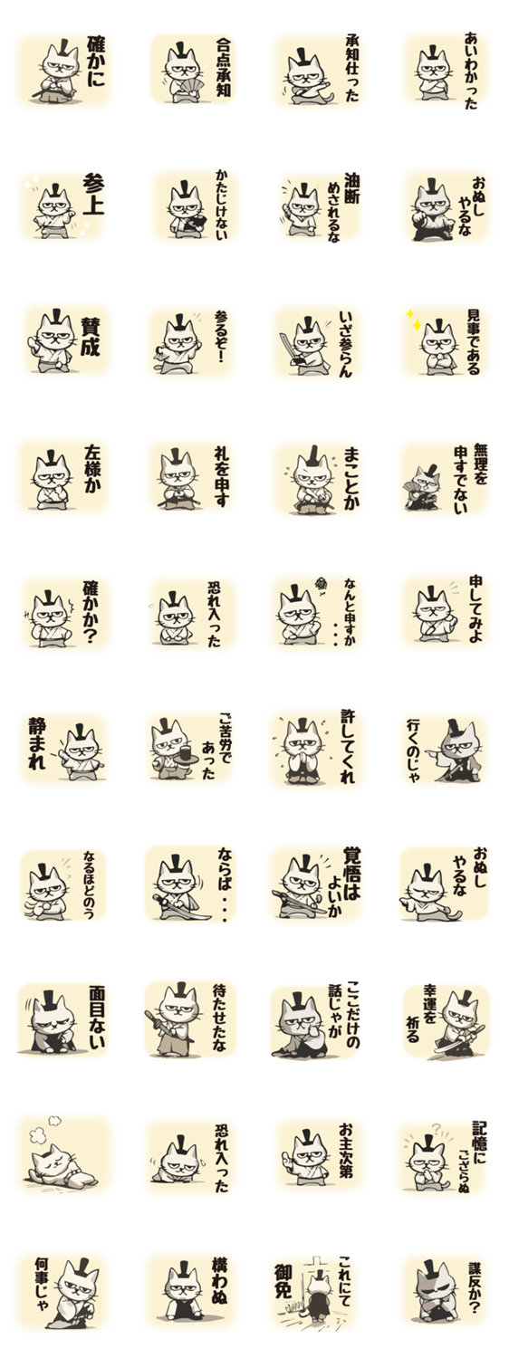武士の言葉を使う、ねこのスタンプ。手描き ニヒル かわいい