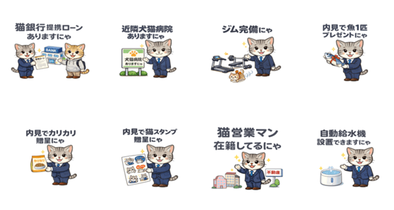 不動産売買の現場で使える猫の営業マンLINEスタンプ。内見案内、ローン相談などお客様とのやり取りをやさしくサポート。