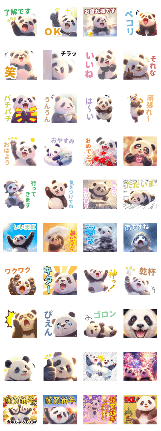 | スタンプ説明 | 一年中日常生活で使える可愛いパンダ/年末年始旧正月年賀あけおめ対応。丁寧/挨拶/可愛い/かわいい/気づかい/見やすい/誕生日/ずっと/春節/卒業/ズザーッ/ふちどり/天気 |