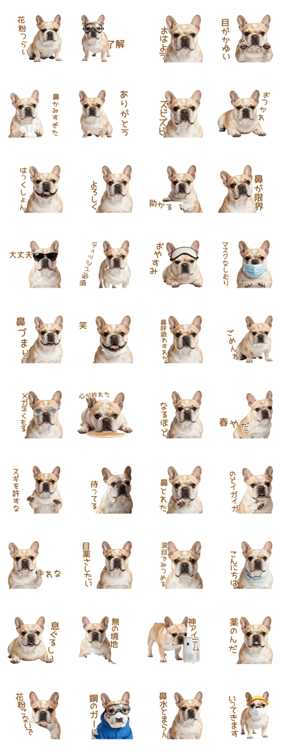 | スタンプ説明 | もちもちフレンチブルドッグが花粉と戦う春。つらい鼻水もかわいい癒し系犬スタンプで乗り切ろう!友達や家族へ毎日使える便利な日常挨拶もたっぷり入っています。 |