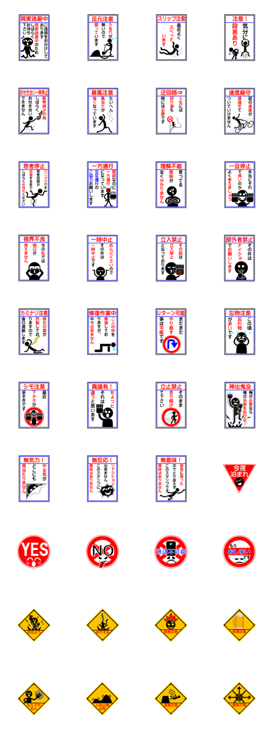 道路標識や工事看板風のゆる~いスタンプです。返事に困った時や、めんどくさい時に使えるかも…