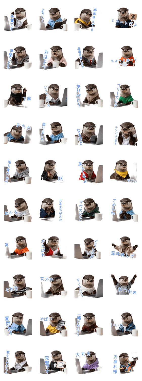 | スタンプ説明 | 「ミュートだよ」「フリーズした」などテレワークあるある満載!サボりたいのに新人教育を任され、画面共有に四苦八苦しテンパる在宅勤務カワウソのシュールなスタンプ。 |