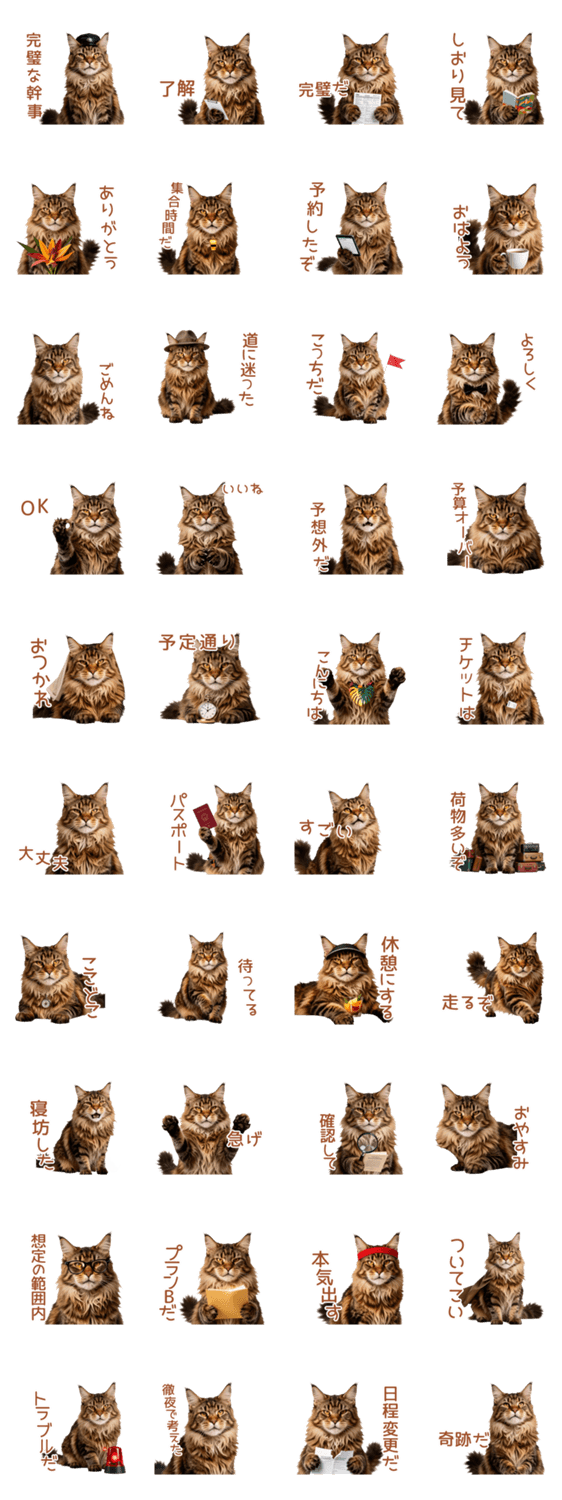 | スタンプ説明 | 仕切りたがりメインクーンが自信満々に幹事を担当!ドヤ顔で仕切るけど道に迷って予算オーバー?友達との旅行計画にぴったりな、ちょっとズレた猫スタンプ。 |