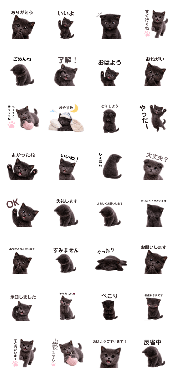 大人かわいい黒猫スタンプ。普段使い+敬語もOK。ありがとう・ごめんね・お疲れさま等、毎日使える表情を揃えました。