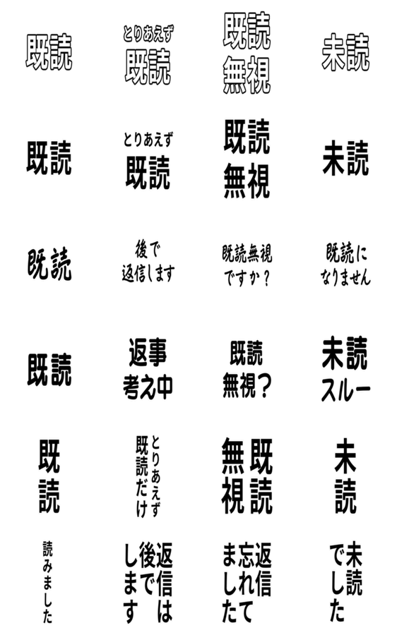 見やすい!でか文字・気分によって使い分けできる色々な書体・黒文字は白色縁取り・とりあえず既読・既読無視・未読・後で返信・返事考え中・未読スルー・忘れてました ※このスタンプはトークルームで大きく表示されるBIGスタンプです。