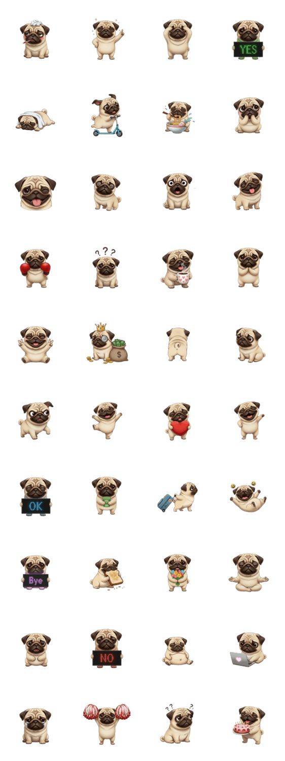 | スタンプ説明 | セリフなし、 文字なしのスタンプ, 無言のスタンプ, 可愛い犬のアニメ, 面白い顔の犬, パグ |