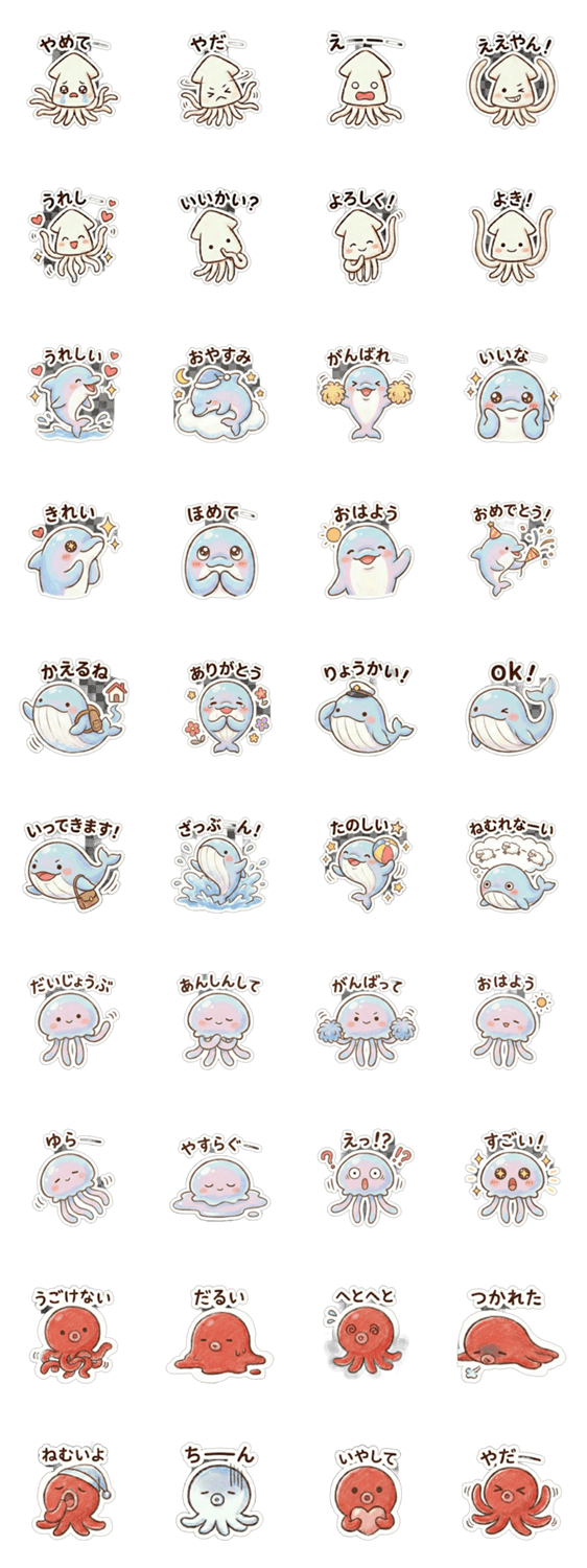 日常の挨拶からちょっとしたリアクションまでおまかせ!ふんわり優しいタッチで描かれた海の動物たちが、家族や友達とのトークを癒やします。