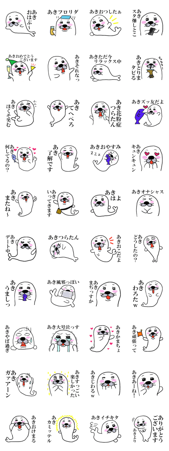 | スタンプ説明 | 全国各地にいる、あきさんのためのスタンプです。日常のいろいろな場面でお使いいただけます。 |