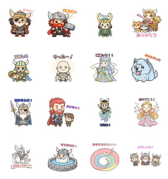 オーディン、トール、ロキ、フレイヤなど、北欧神話の神様たちが可愛いデフォルメキャラになって登場!⽇常会話で使いやすい16枚セットです。
