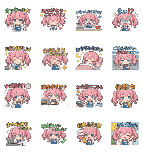 ピンク髪の店員ちゃんが、毎日のあいさつや会話をかわいく盛り上げてくれるスタンプです。お仕事でもプライベートでも使いやすい内容です。
