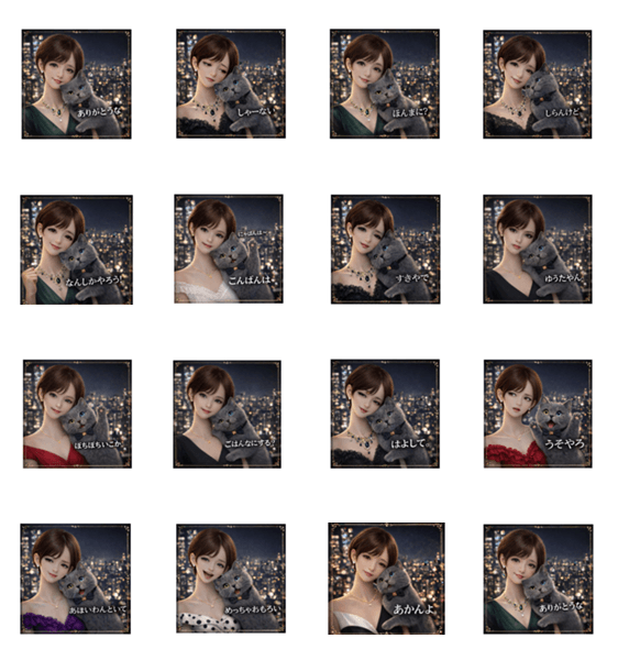 | スタンプ説明 | 夜景のきらめきとともに、 上品でちょっぴりユーモラスな関西弁をお届け。 JUNKOとオッドアイの愛猫おっくんが、 大人かわいい会話を彩ります。 |