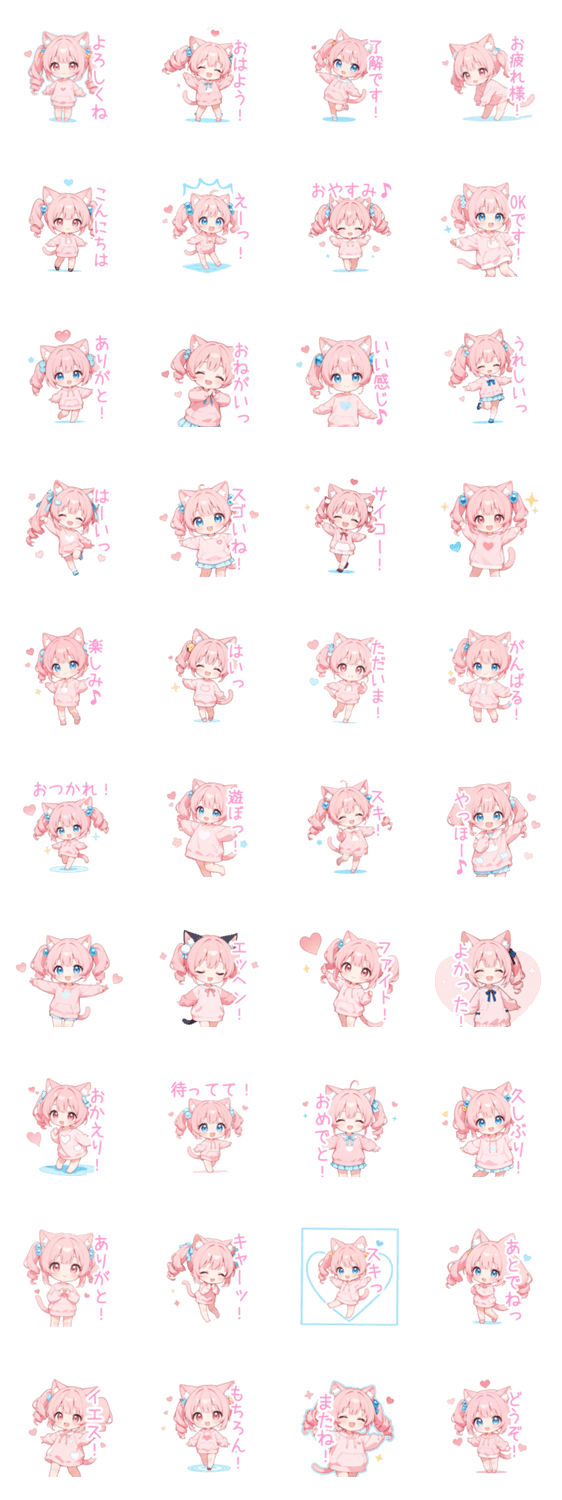 ピンク/ツインテール/猫/猫耳/ゆるかわ/ピンク髪/かわいい/可愛い/挨拶/日常/会話/涼しい/女の子/女子/癒し/ゆるい/ふわふわ/ちびキャラ/ミニキャラ/デフォルメ/花/ハート
