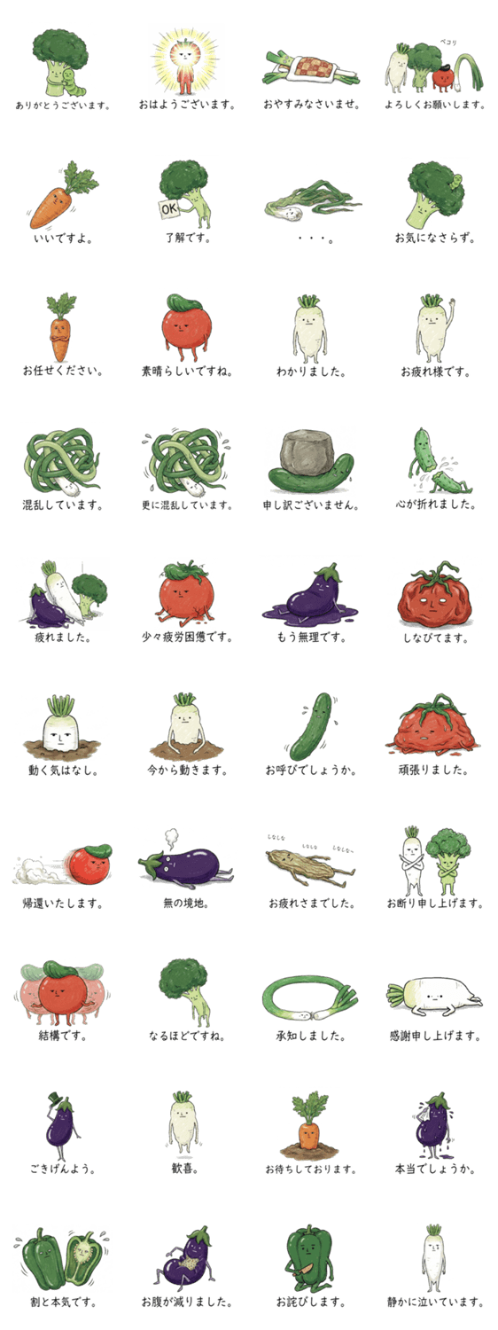 感情を失った真顔の野菜たち。丁寧だけど温度差がすごいシュールな敬語スタンプです。挨拶から虚無まで、上司や友人への返信を独特な空気感に変えてくれます。
