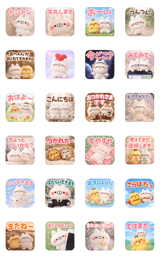 | スタンプ説明 | 飛び出す★ねことうさぎのシリーズ。会話のはじまり・きっかけと、締めに使えるスタンプ。ぬいぐるみ/ひよこ/猫/挨拶/かわいい/山田まぽん作 |