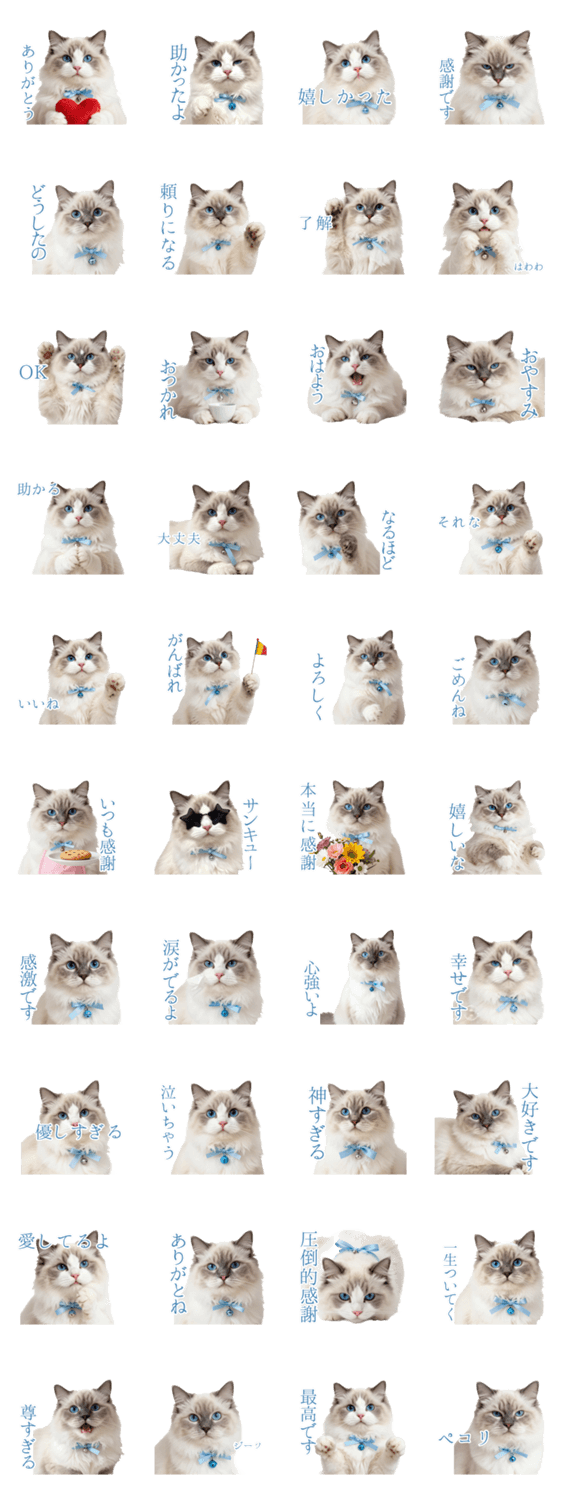 | スタンプ説明 | 優しく寄り添い全肯定する、聞き上手ラグドール猫。相談に乗る時の相槌や、癒したい・感謝を伝えたい時にぴったり!家族や友達との会話がもっと心温かくなるスタンプ♪ |