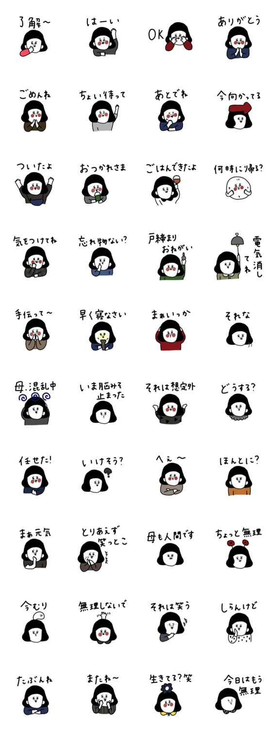 | スタンプ説明 | 完璧じゃない母、ここにいます。家族LINEでつかいやすい。シュールでよき。 |