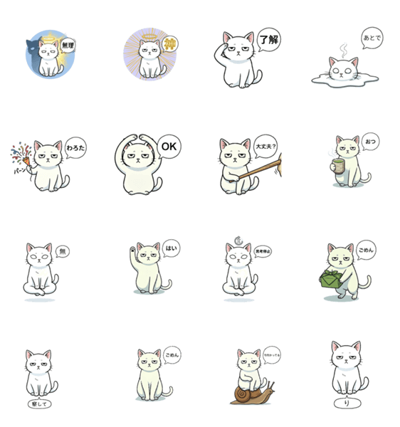 どこか冷めた目をした白いねこのスタンプです。「無理」「神」「それな」など、現代人の本音をシュールに可愛く代弁します。