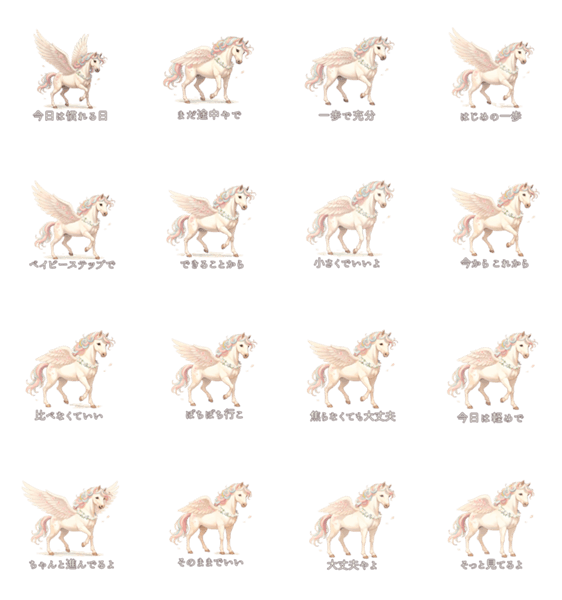 | スタンプ説明 | 春の光のようにやわらかく寄り添う、大人のペガサス。 がんばりすぎない毎日に、静かなひとことを届けます。 落ち着いた色合いの応援スタンプです。 |